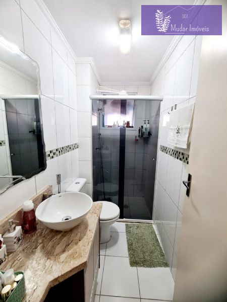 - Banheiro social completo com box de vidro, espelho, gabinete e piasobreposta;