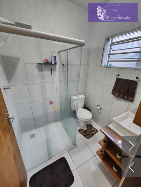 - Banheiro social amplo com box de vidro, gabinete e espelho;